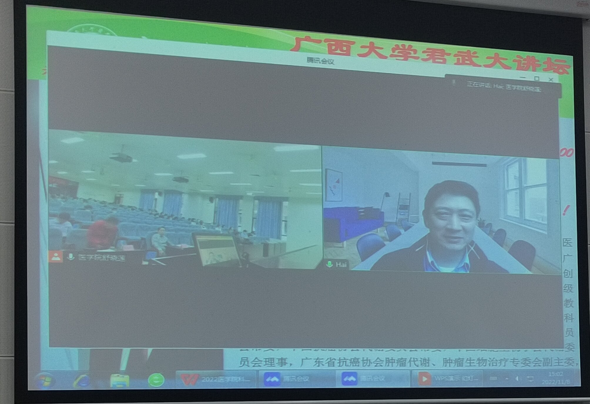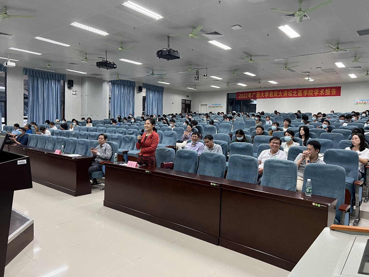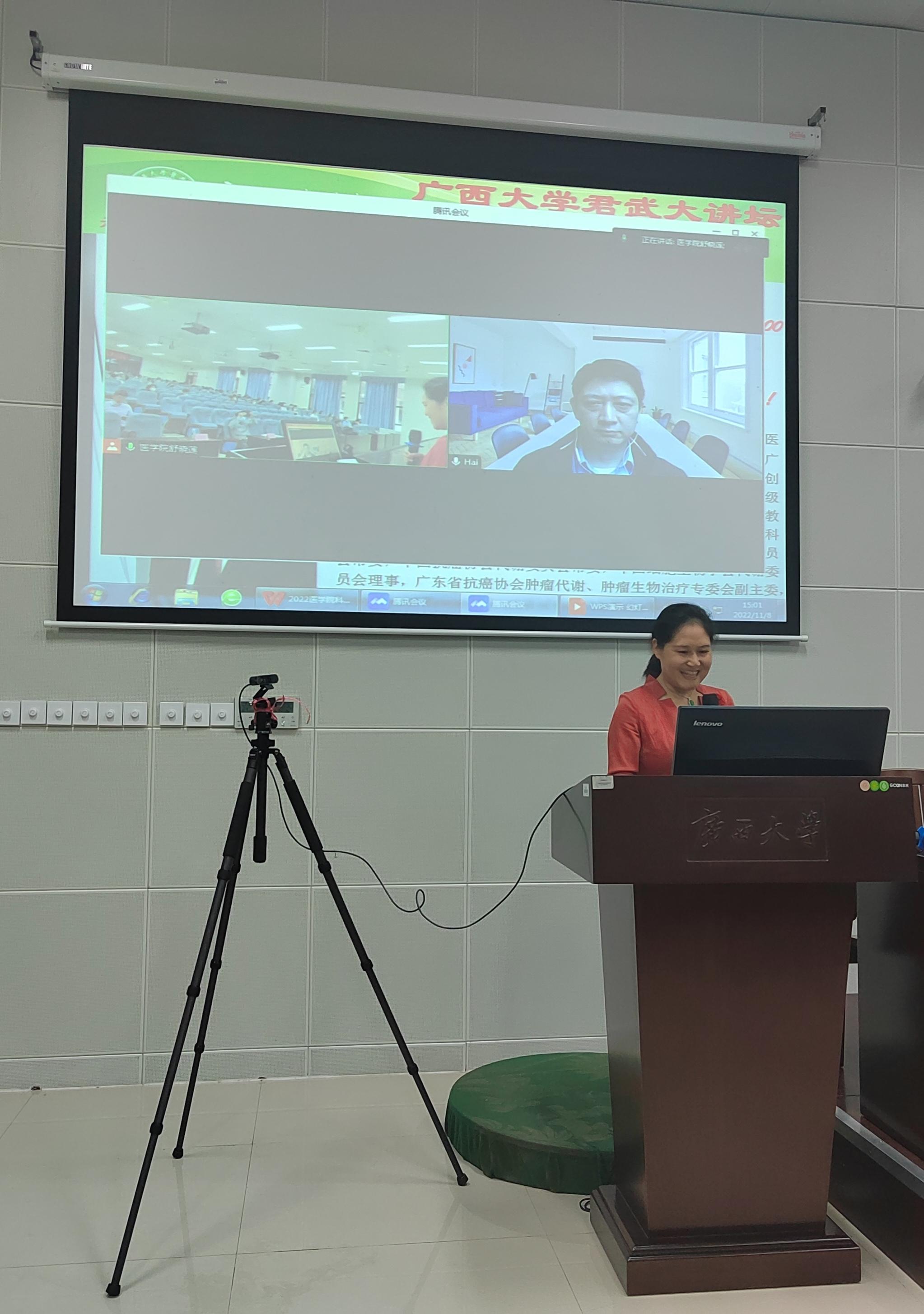 为了加强师生们的交流与合作, 2022年11月8日,金沙集团3354cc君武大讲坛之金沙集团3354cc科技活动月暨生物医药论坛(第一讲)在六教二阶召开。应金沙官网邀请,中山大学孙逸仙纪念医院胡海教授线上为学院师生做了题为“乳腺癌代谢与转化研究”的学术报告。学院学术院长罗素兰、常务副院长王立升以及学院专任教师和博士、硕士研究生130余人参加了此次报告会。